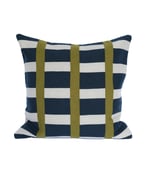 A patchwork cushion with a linear pattern design inspired by the simple, clean lines of Modernist architecture.