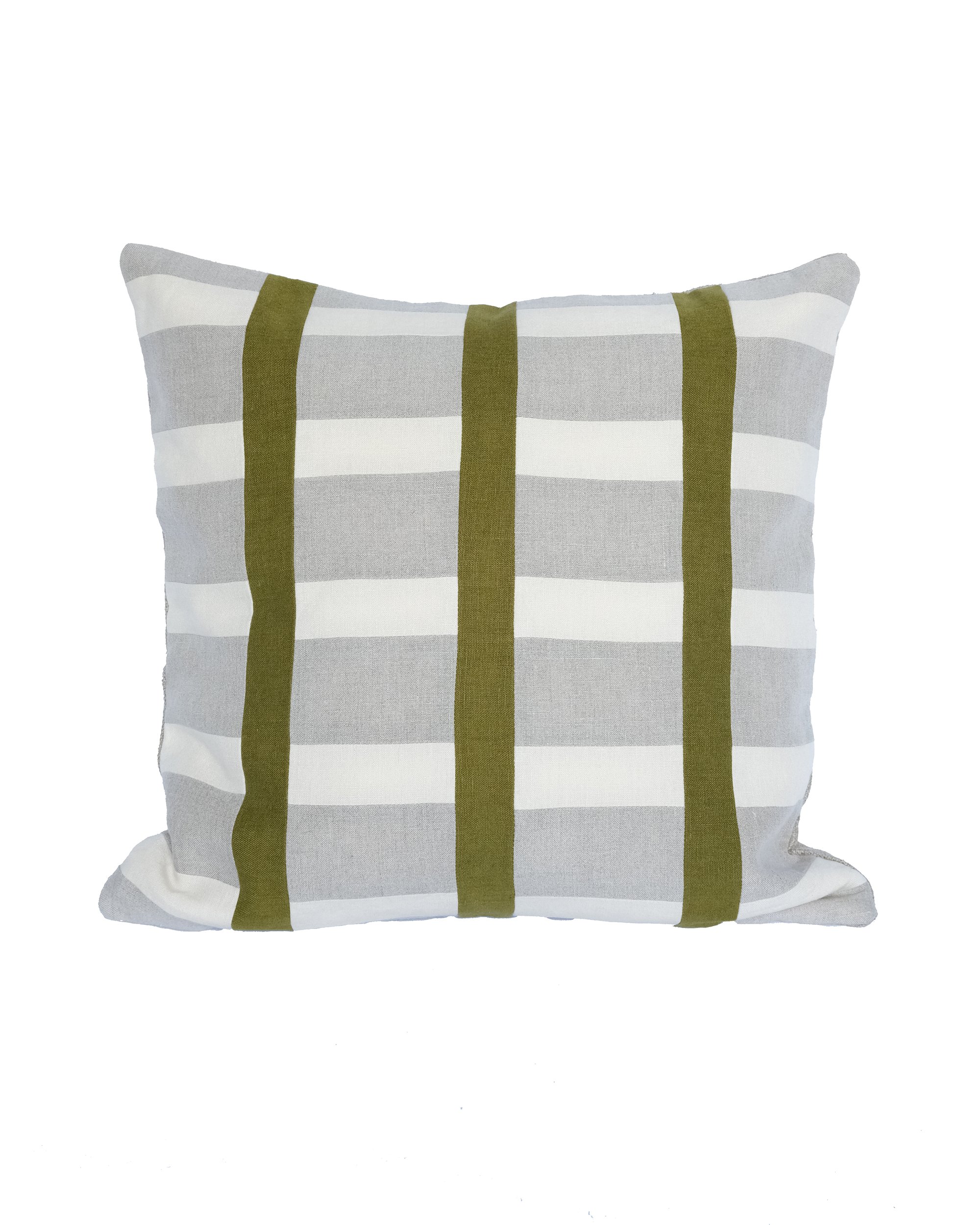 A patchwork cushion with a linear pattern design inspired by the simple, clean lines of Modernist architecture.