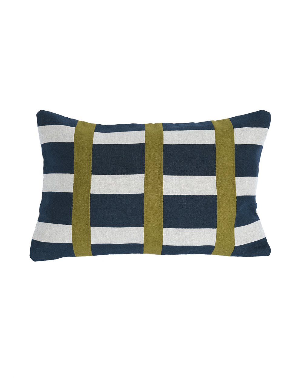 A patchwork cushion with a linear pattern design inspired by the simple, clean lines of Modernist architecture.